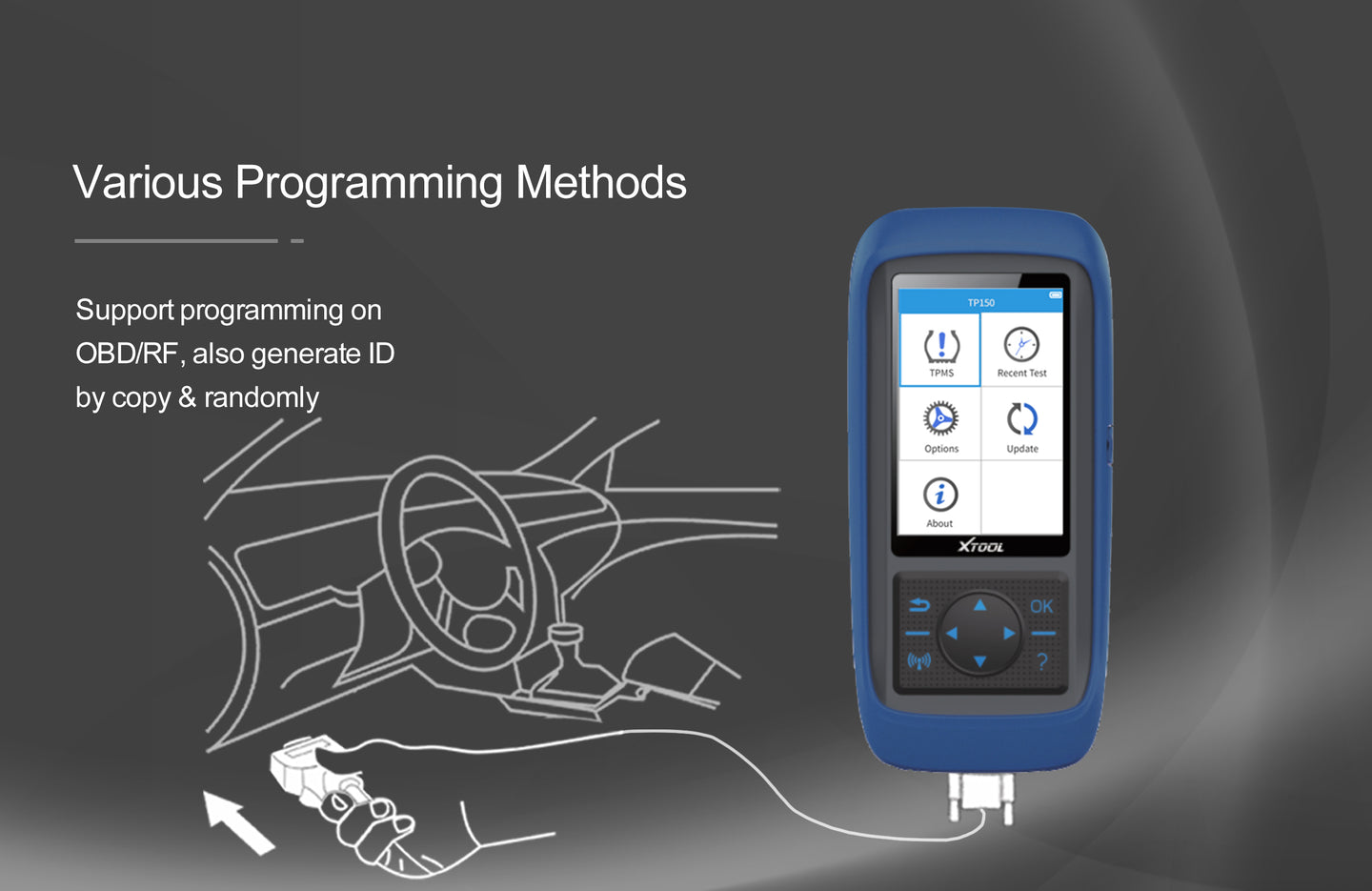 TP150 is a special inspection device launched by Xtool for the automotive tire pressure diagnosis market, which integrates tire pressure programming, tire pressure diagnosis, and tire pressure matching. It supports activation of 315MHz and 433MHz tire pressure sensors, can perform tire pressure diagnosis on thousands of models, and can wirelessly program 1-8 TS100 universal programmable tire pressure sensors, which makes it suitable for different models.